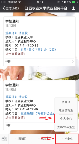 手机微信端关注“江西农业大学就业服务平台”公众号,登录后需要和手机微信绑定,通过微信扫描进入“江西农业大学就业服务平台”公众号进行操作。