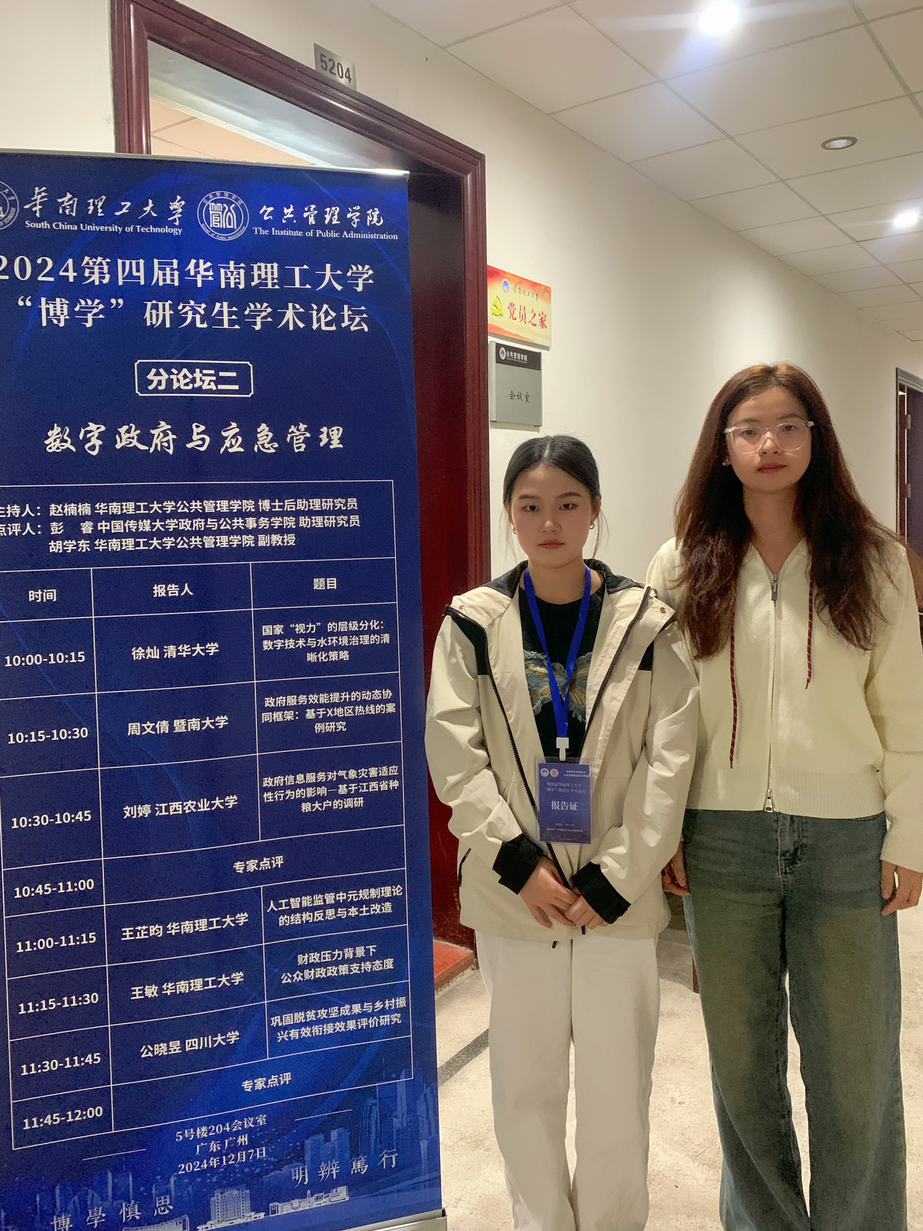 2024年12月7日,第四届华南理工大学“博学”研究生学术论坛在华南理工大学五山校区成功举行。本次论坛以“治理现代化视域中公共管理研究的多样性”为主题,吸引了来自全国134所高校及科研机构的优秀研究生和青年学者参会。我院研究生刘婷、蔡莹枢参加了此次会议,并在会议中进行了论文汇报。