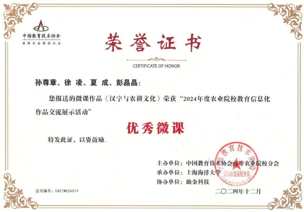 12月29日,中国教育技术协会高等农业院校分会公布了2024年高等农业院校教育信息化作品交流展示评选结果,徐凌老师设计的“‘文化承古今、智慧启未来’——信息技术赋能‘中国文化导论’创新实践案例”和孙尊章老师主讲的“汉字与农耕文化”微课视频(团队成员:徐凌、夏成、彭晶晶),分别荣获2024年高等农业院校教育信息化作品交流展示评选活动“教育数字化转型优胜案例”和“优秀微课作品”。此次展示活动由中国教育技术协会高等农业院校分会主办,旨在贯彻落实国家数字中国建设和教育数字化战略行动部署,加快推进农业高校教育数字化转型和智能化升级,促进信息技术与教育教学融合创新。这两项获奖,是我院教育信息化成果的体现。