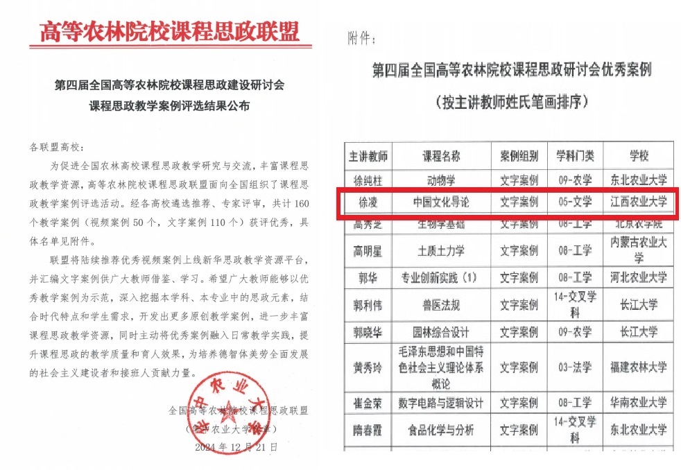 近日,由高等农林院校课程思政联盟主办的第四届全国高等农林院校课程思政建设研讨会,评选出了全国高等农林院校课程思政优秀案例。徐凌老师精心设计的“‘汉字承华夏、文化育国魂’——汉字与文化”教学案例在全国780份优秀案例中崭露头角,荣获课程思政教学优秀案例殊荣。据悉,联盟面向全国广泛征集课程思政教学案例,经过各高校的精心遴选与专家的严格评审,最终评选出160个优秀教学案例,其中包括50个视频案例和110个文字案例。这些优秀案例将在新华思政网平台上线展示,此次获奖将提升了我院课程思政建设的社会影响力和美誉度。