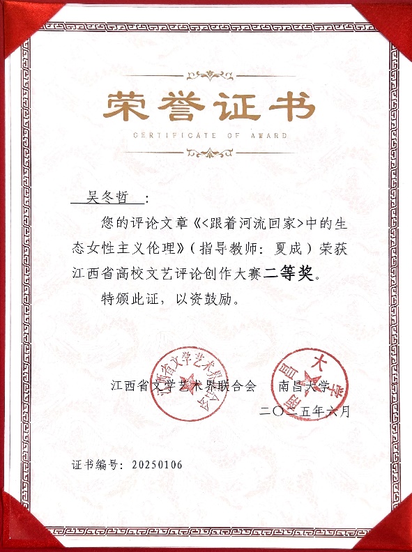 6月19日,江西省高校文艺评论创作大赛颁奖典礼在南昌大学举行。我院中文系学生吴冬哲的论文《〈跟着河流回家〉中的生态女性主义伦理》(指导教师夏成)荣获大赛二等奖。