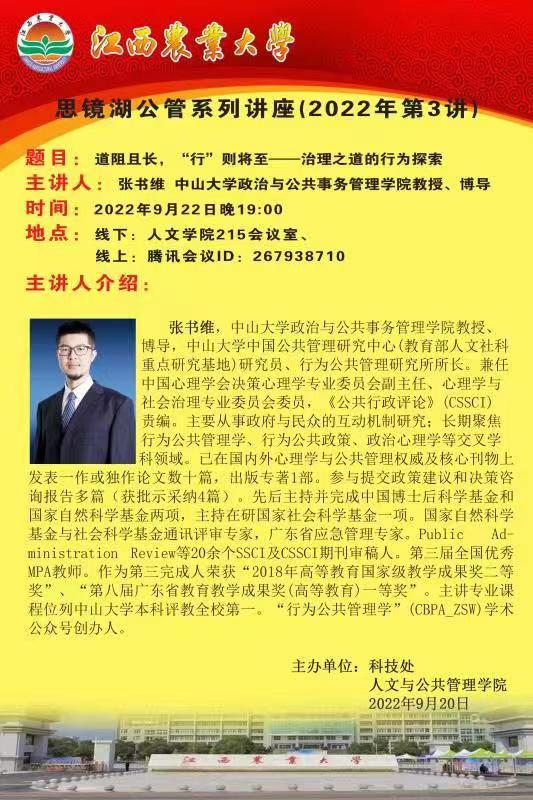 学术讲座预告:9月22日 治理之道的行为探索 张书维