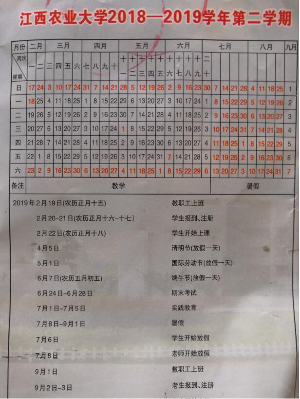 江西农业大学2018—2019学年第二学期校历