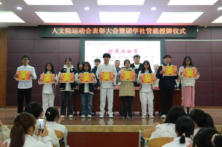 为庆祝我院运动员在此次校运会中取得的优异成绩,表彰先进、树立榜样,增强我院学生干部的工作责任心和集体荣誉感,11月14日晚,我院于大学生活动中心501举行运动会表彰大会暨团学社管就授牌仪式。院党委副书记曹人龙、全体辅导员、优秀运动员与教练员、团学社管就全体成员参与本次活动。