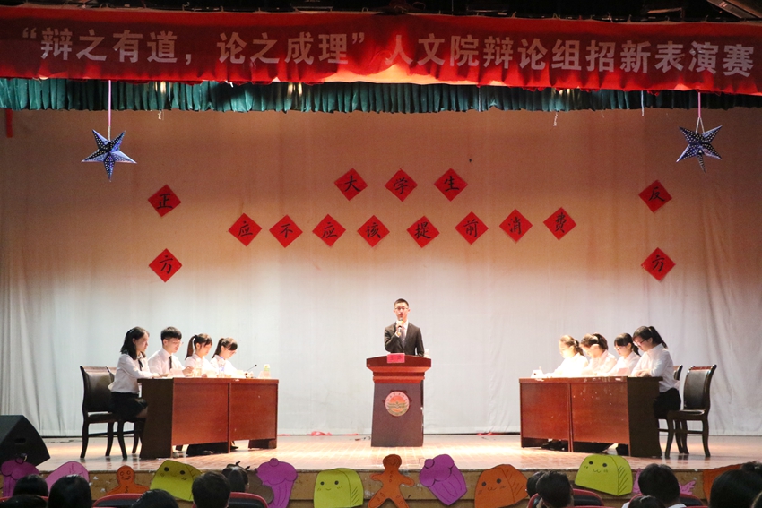 为帮助我院新生了解辩论,进一步开展辩论组招新工作,我院于9月20日晚在音乐厅举办了以“辩之有道,论之有理”为主题的招新表演赛。院团委副书记王桂兰、团委指导老师鹿光耀莅临比赛现场。