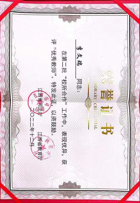 日前,江西省司法厅、江西省教育厅联合印发了《关于通报表扬第二批“校所合作”工作优秀教师先进单位的决定》,我院李文瑞老师喜获“校所合作”工作优秀教师称号。