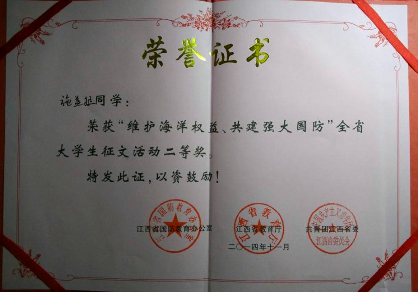 我院法学1301班施益挺同学在“维护海洋权益,共建强大国防”全省大学生征文活动中获得二等奖。