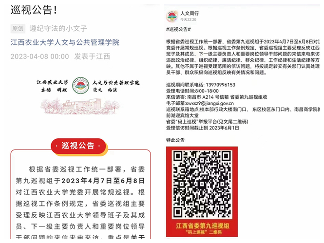巡视期间为便于干部群众反映情况,设立了专门联系的电话,电话号码:13970996153,受理时间是从早上的8点到晚上的6点。邮政信箱,南昌市A214号信箱,同时在校本部行政大楼南门口、东区门口、南昌商学院教学楼门口以及前湖迎宾馆大堂都分别设立了联系信箱,巡视组受理信访的时间截止到2023年6月1号。