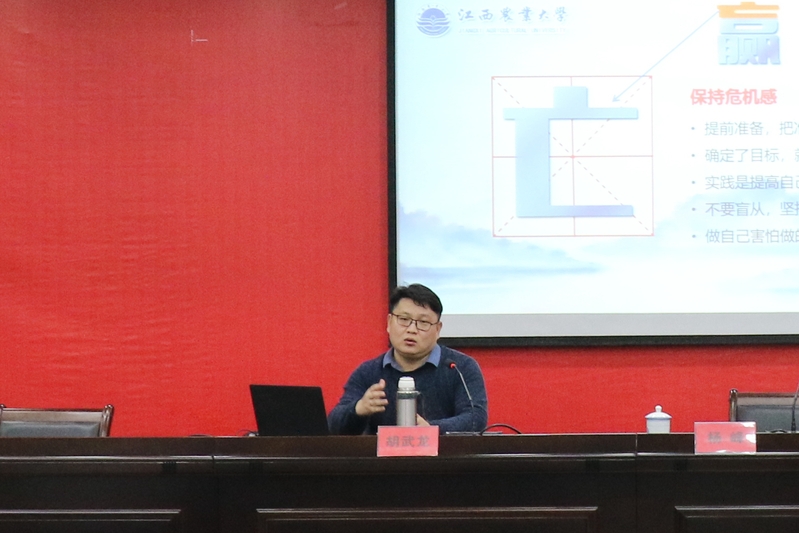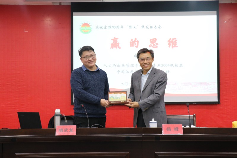 为喜迎江西农业大学115年华诞,我校邀请了16位优秀校友回到母校举办“惟义”校友报告会。11月12日晚,我校邀请了我院新闻学08届毕业生、中国江西网新媒体中心主任胡武龙作报告。胡武龙在校办一楼报告厅为广大学子作了题为“赢的思维”的报告。我院党委书记杨峰主持了报告会,并代表学校向胡武龙校友赠送校徽留念。